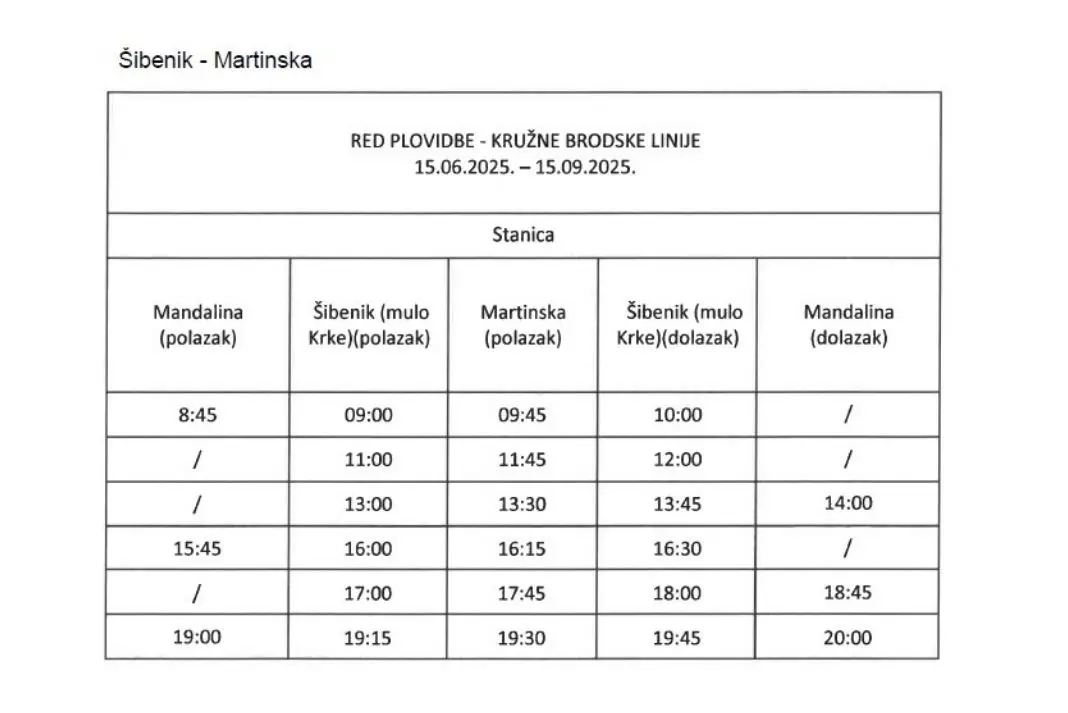 I ovog ljeta Šibenik svojim građanima i gostima osigurava kružnu brodsku liniju Avalon, koja vozi iz centra grada (Mulo Krke) do Martinske i natrag. Cijena karte u jednom smjeru na liniji Mandalina – Šibenik – Martinska iznosi 2 eura, a povratna karta košta 3 eura. djeci do šest godina, vožnja je besplatna. Raspored plovidbe pronađite na fotografiji.